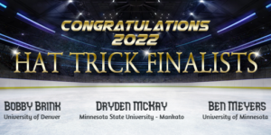 The three hat trick finalists have a distinct Minnesota flavor. Two of the three were born and raised in Minnesota (Brink and Meyers) and two of the three play for Minnesota schools (McKay and Meyers) who incidentally, will be opposing each other in the national championship semi-final game on April 7. A record six of the top ten Hobey Baker finalists will be playing in the NCAA national championship tournament. All four schools will have a Hobey top ten finalist in the tourney.